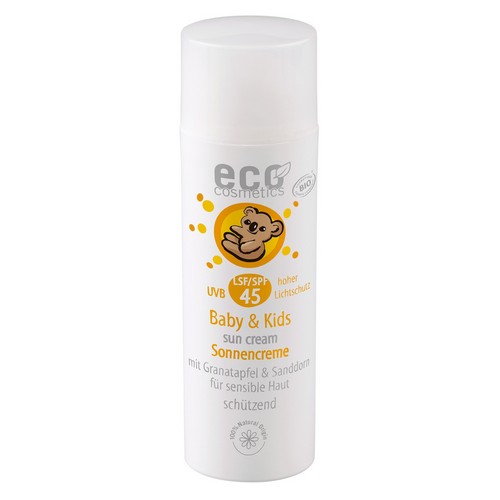 Hoher Lichtschutz für zarte Baby- und Kinderhaut. Die Baby & Kids Sonnencreme LSF 45 von eco cosmetics bietet einen Breitbandschutz vor UVA - B -C . Die sanfte Creme zieht rasch ein, weißelt nicht und wirkt direkt nach dem Auftragen. Auch kleine Wasserratten sind durch die wasserfeste Formel bestens geschützt. Granatapfel*,Oliven*- und Macadamiaöl* sorgen für Feuchtigkeit und Pflege. Sanddornextrakt* und Nachtkerzenöl* schützen besonders sensible Haut. Eine natürliche Duftkomposition verleiht einen angenehmen, milden Duft.