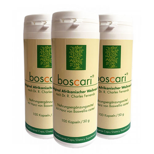 Eine Boscari Kapsel nach Dr. R. Charles Fernando enthält 400 mg afrikanisches Weihrauchharz. Nehmen Sie täglich nach dem Essen eine Boscari Weihrauchkapsel mit reichlich Wasser ein. Bei Schluckschwierigkeiten können Sie den Kapselinhalt auch in kalte Speisen oder Speiseöle einrühren. Die sehr gute Verträglichkeit macht Boscari Weihrauchkapseln auch geeignet für eine Langzeitanwendung.