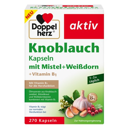 Dank ihrer magensaftresistenten Hülle lösen sich die Kapseln durch ein spezielles Herstellungsverfahren erst im Dünndarm auf. Dadurch sind sie weitgehend geruchlos und angenehm einzunehmen. Knoblauch – botanisch Allium sativum – stammt ursprünglich aus Westasien und zählt zu den ältesten Kulturpflanzen der Welt. Schon im alten Ägypten wurde Knoblauch in der Ernährung geschätzt. Auch in unseren Breiten erfreut er sich seit Langem großer Beliebtheit. Viele Menschen verzichten jedoch auf den Verzehr, da sie den intensiven Geruch als unangenehm empfinden. Neben Zubereitung aus Knoblauch enthalten die Kapseln auch Weißdorn (botanisch Crataegus), dessen rote Früchte durch ihren säuerlich-süßen Geschmack überzeugen und essbar sind. Ein weiterer Bestandteil ist ein Ölmazerat aus Mistelkraut, das von der immergrünen Mistel gewonnen wird. Diese besondere Pflanze wächst auf Bäumen, indem ihre Keimlinge ihre Wurzeln in den Wirtsbaum treiben und sich als „Schmarotzer“ von dessen Wasser und Nährstoffen ernähren. Abgerundet wird die Rezeptur durch Vitamin B1 (Thiamin), das zur normalen Funktion von Herz und Nervensystem beiträgt.