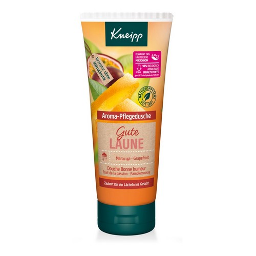 Genießen Sie einen unbeschwerten Moment des Glücks mit der fruchtig heiter duftenden Kneipp® Aroma-Pflegedusche Gute Laune mit natürlichen Ölen aus Maracuja und Grapefruit. Der exotische Duft belebt die Sinne und zaubert ein Lächeln auf Ihr Gesicht. Trübsal löst sich beim Duschen in Luft auf. Natürliches pflegendes Öl macht die Haut zart und geschmeidig. Die pflanzliche Pflegeformel verbessert das Hautgefühl während und nach dem Duschen. Eine Studie* bestätigt zudem, dass die Haut vor dem Austrocknen geschützt wird. | * Experimentelle Studie: Messung der Hautfeuchtigkeit nach Anwendung.