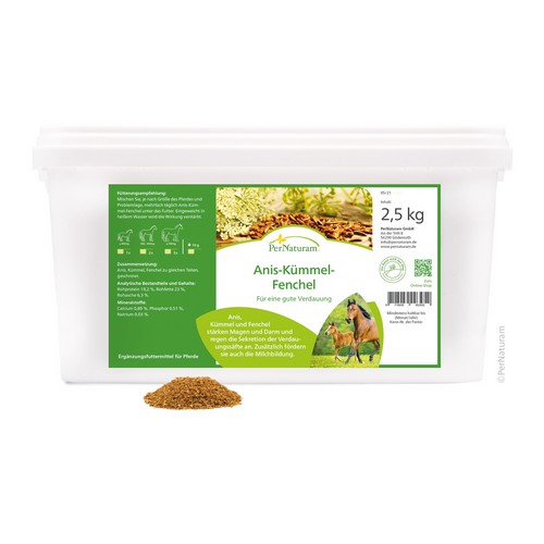 Mischen Sie, je nach Größe des Pferdes und Problemlage, täglich mehrfach bis zu drei Messlöffel PerNaturam Anis-Kümmel- Fenchel unter das Futter. Eingeweicht in heißem Wasser wird die Wirkung verstärkt.